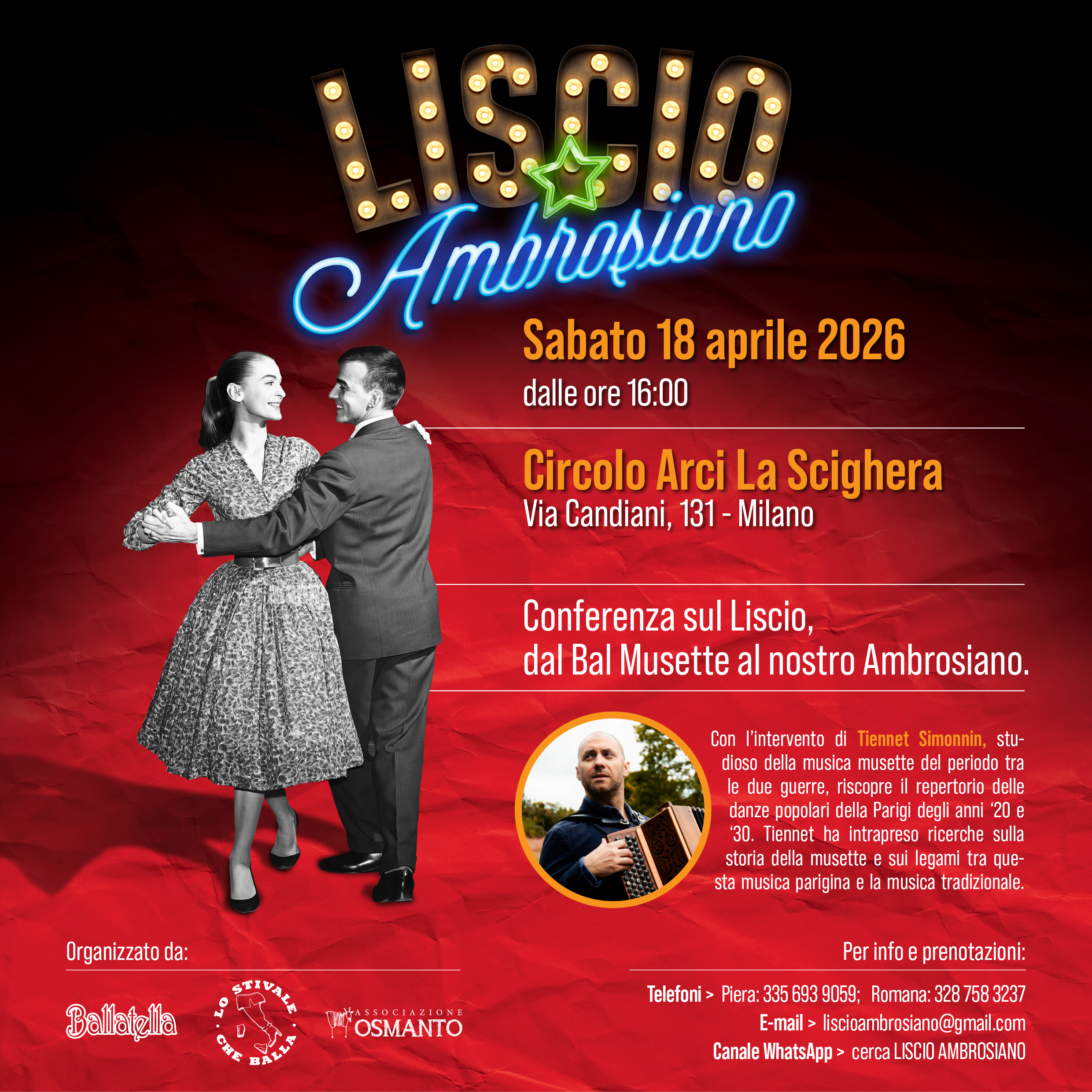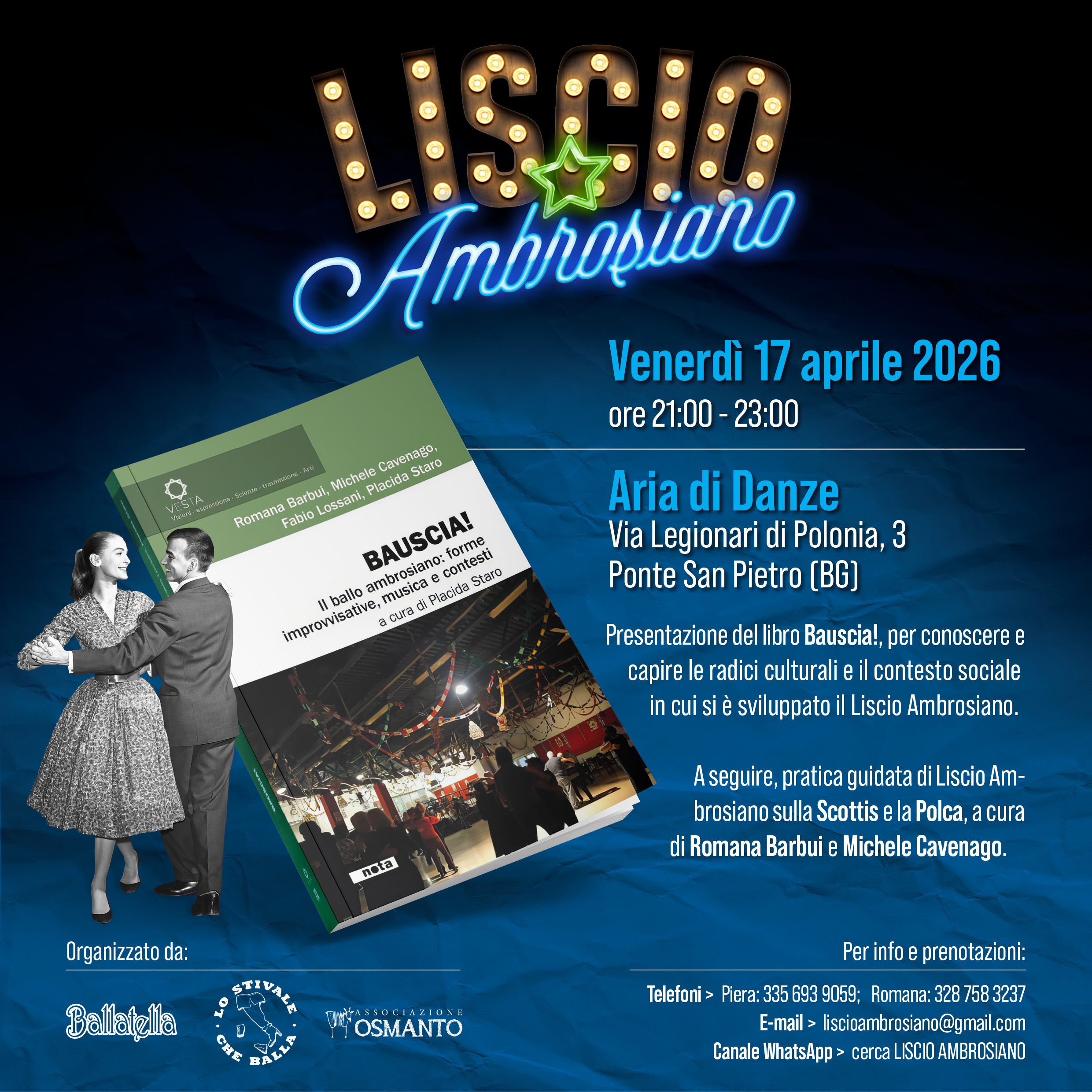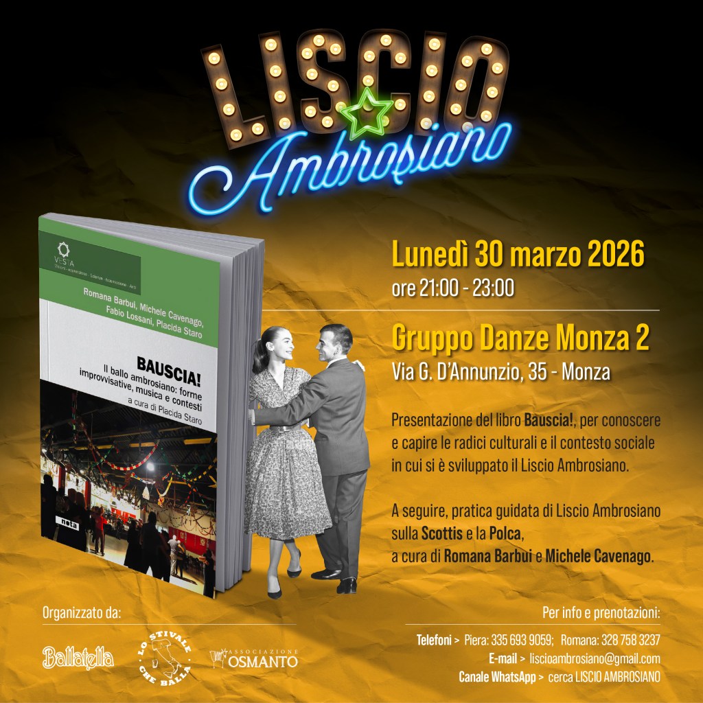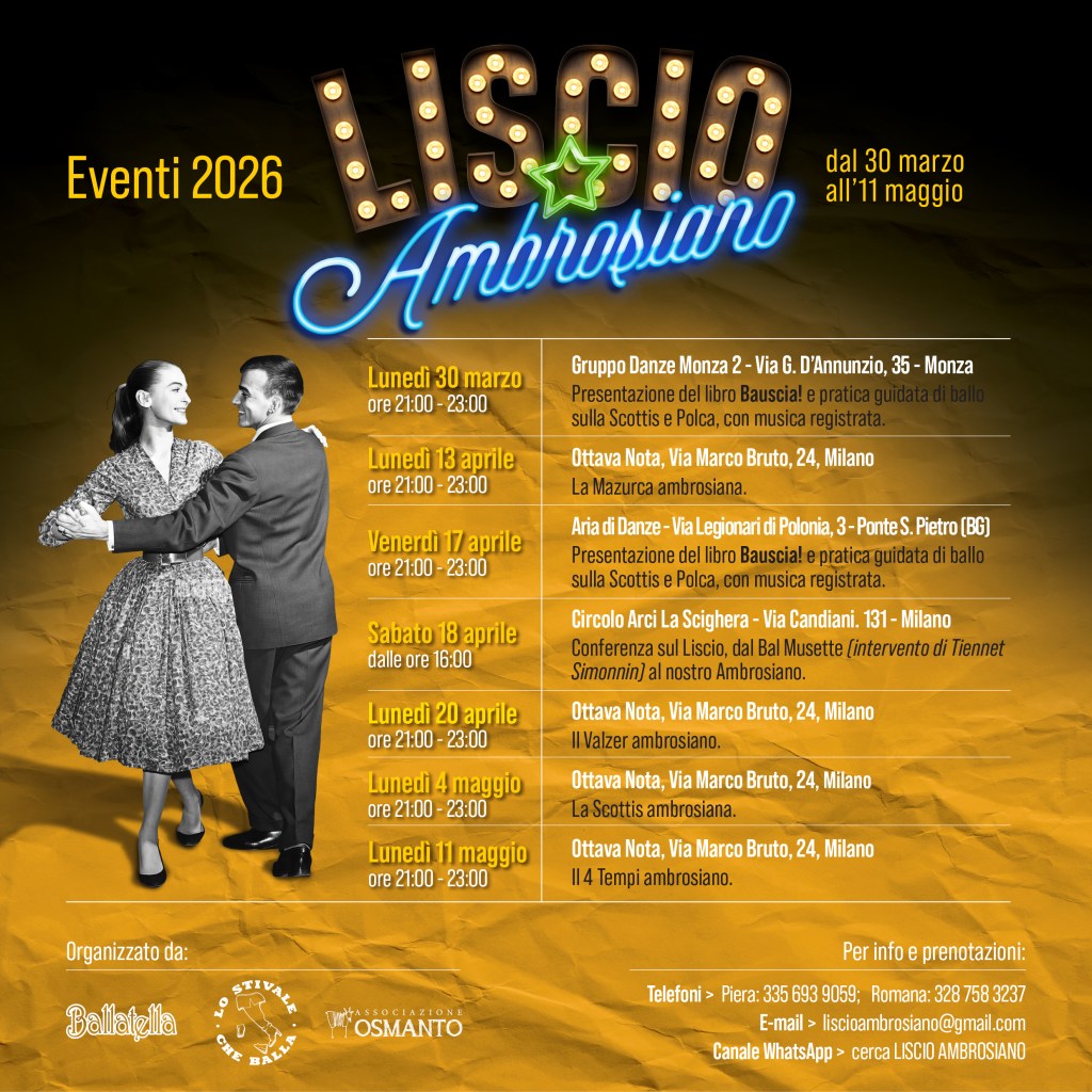 Tante novità!!! IL CORSO di liscio ambrosiano, 4 appuntamenti per approfondire il ballo liscio di Milano a Milano! La presentazione del libro BAUSCIA a Monza e a Ponte san Pietro, in provincia di Bergamo. Il confronto presso l’arci Scighera di Milano tra il bal musette parigino e il ballo ambrosiano di Milano.