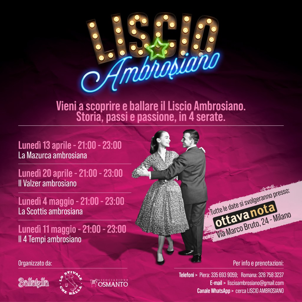 Finalmente si muove qualcosa, c’è il germe di un nuovo interesse attorno a questo ballo della vecchia Milano, il ballo ambrosiano, o liscio ambrosiano o (più raramente) ballo meneghino. Tre associazioni si sono ritrovate a discutere su modi, tempi, luoghi, relazioni per non perdere del tutto questo piccolo tesoro cittadino. Chi sono queste associazioni? Presto detto: Osmanto con una bella storia di proposte in Brianza, Ballatella radicata a Lecco e Stivale che Balla, cioè noi, che ci muoviamo un po’ dove capitata, soprattutto nel milanese e dintorni.