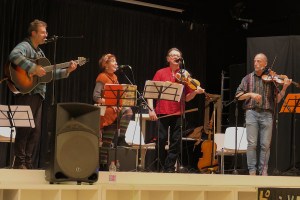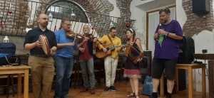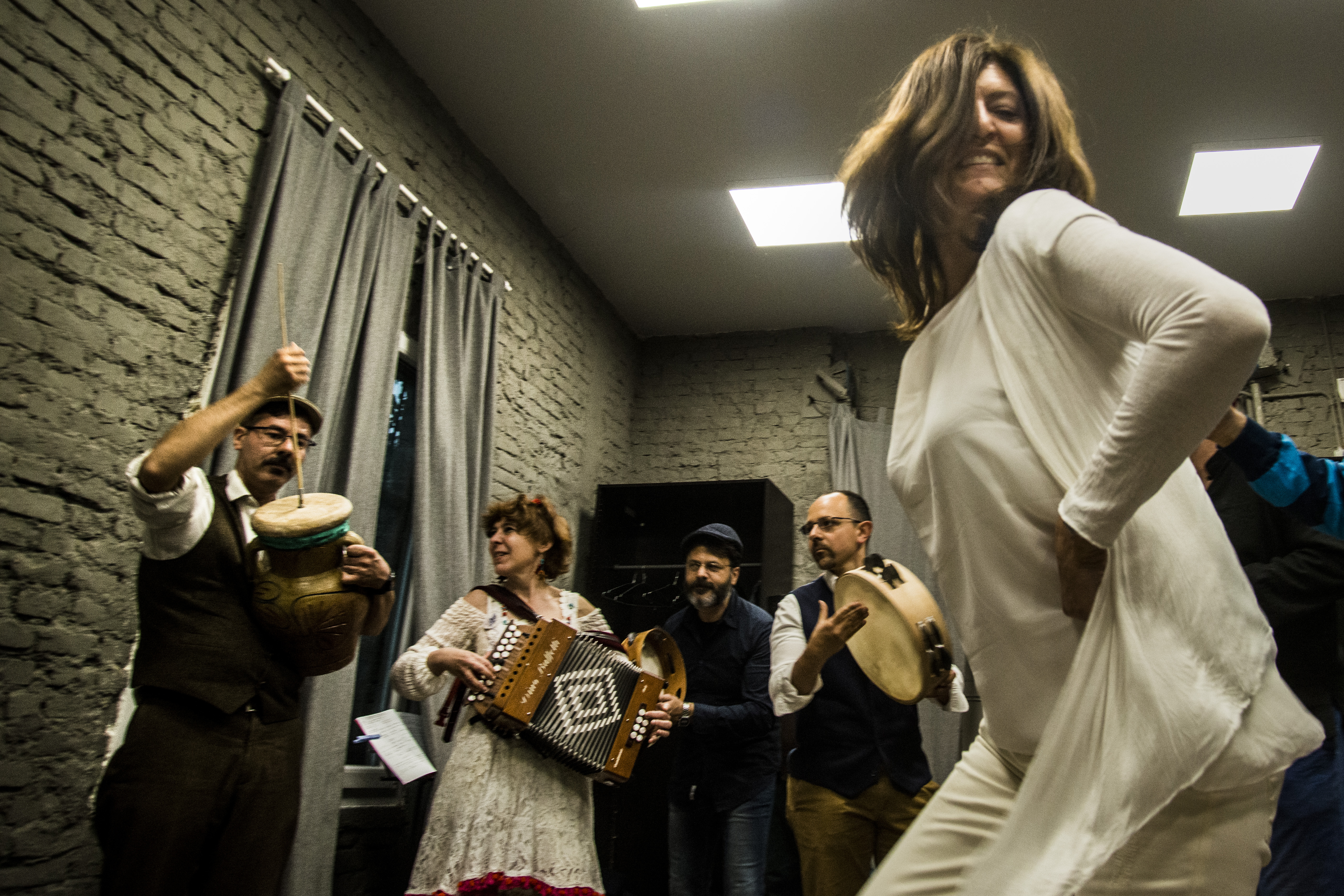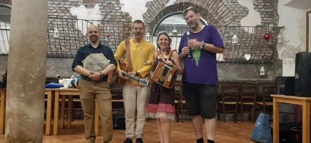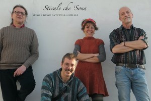 Da sinistra: Antonio Castronuovo percussioni popolari, Massimiliano Aquilino chitarre (classica, battente, terzino calabrese), lira calabrese, sordulina, Romana Barbui organetti, Michele Cavenago flauto e ballo